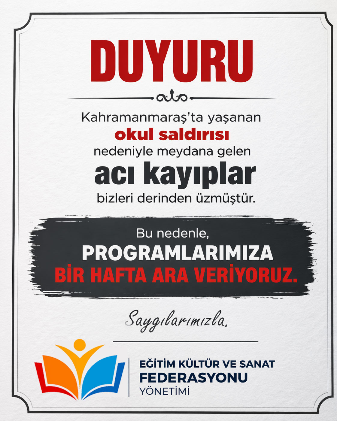 “Kahramanmaraş’ta yaşanan okul saldırısı sonucu meydana gelen acı kayıplar bizleri derinden üzmüştür.