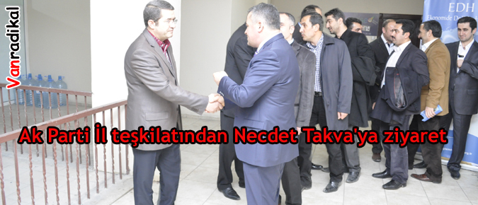 AK Parti Van İl Başkanı Abdullah Aras ve Yönetimi, VATSO seçimlerine aday olan Mirza Nadiroğlu ve Feridun Irak’ı ziyaret ettikten sonra, ziyaretin son durağı Ekonomide Değişim Hareketi sözcüsü Necdet Takva oldu. Ekonomide Değişim Hareketinin faaliyet gösterdiği ofise giden Abdullah Aras ve Yönetimi, burada Necdet Takva ve yönetimi tarafından karşılandı. Karşılıklı selamlaşmanın ardından söze başlayan Takva şunları kaydetti.