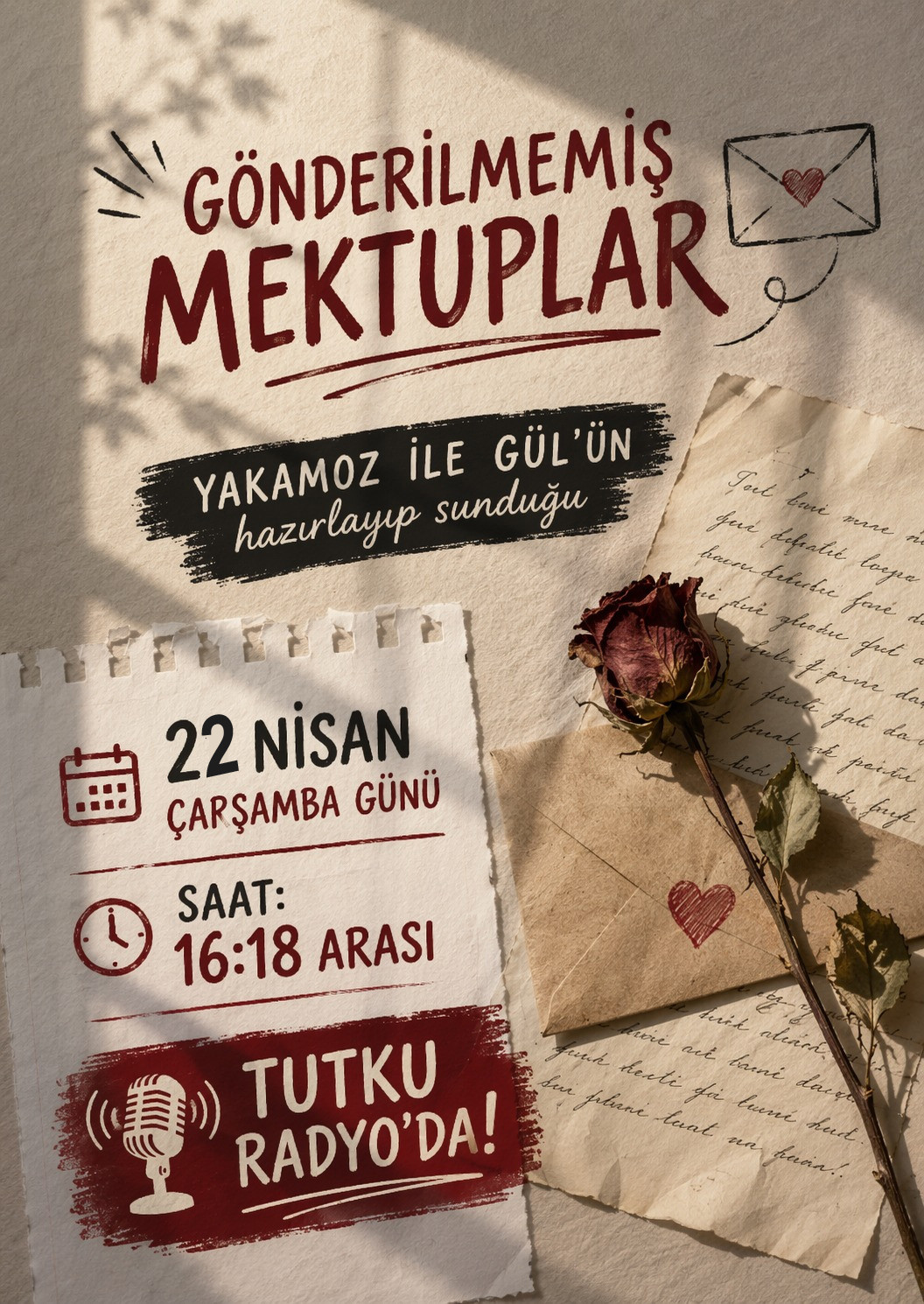 Yakamoz ile Gül’ün özenle hazırlayıp sunacağı programın ilk yayını, 22 Nisan Çarşamba günü saat 16.00 ile 18.00 arasında Tutku Radyo frekanslarında dinleyiciyle buluşacak. Kelimelerin suskun kaldığı yerde mektupların konuşacağı, dile getirilemeyen duyguların satırlara döküleceği bu yolculukta, geçmişin izleri bir kez daha gün yüzüne çıkacak.