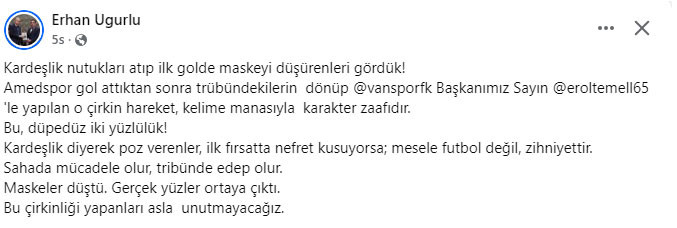 Vanspor yönetiminde yer alan gazeteci Erhan Uğurlu, sosyal medya hesabından yaptığı paylaşımda şu ifadeleri kullandı: