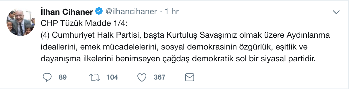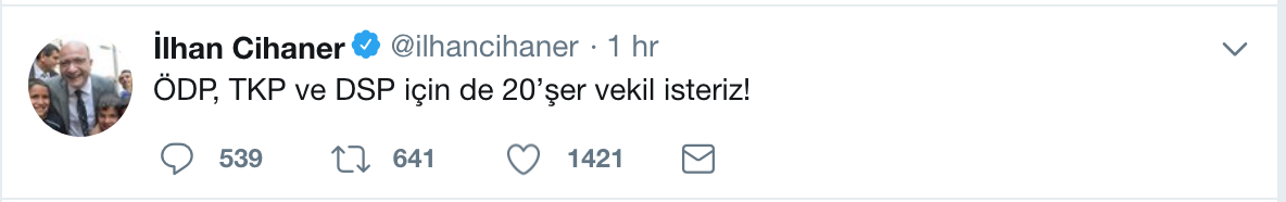 Cihaner, kişisel Twitter hesabından "ÖDP, TKP ve DSP için de 20’şer vekil isteriz!" paylaşımı yapan Cihaner, ardından da CHP Tüzüğü'nün 1 maddesinin 4 fıkrasını paylaştı...