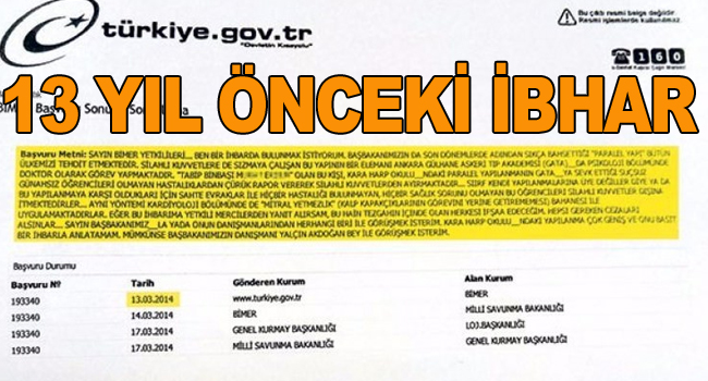 FETÖ’nün sahte sağlık raporuyla okuldan uzaklaştırdığı Kara Harp Okulu öğrencisi H.K.’nın 2014’te Başbakanlık İletişim Merkezi’ne (BİMER) gönderdiği ve adeta 15 Temmuz darbe girişimini ihbar eden başvuru dilekçeleri ortaya çıktı