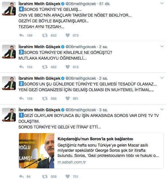Ankara Büyükşehir Belediye Başkanı Melih Gökçek, sosyal medya hesabında yaptığı açıklamada 'Gezi olaylarının arkasında Soros'un olduğunu' ifade ederek "Soros'un şu günlerde Türkiye'ye gelmesi tesadüf olamaz. Yeni Gezi organizesi için gelmiş olması en muhtemel ihtimal." dedi.