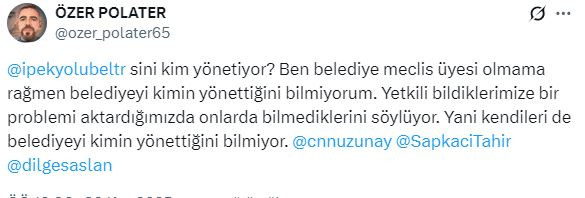 Van İpekyolu Belediyesi’nde yönetim tartışmalarını alevlendiren çıkış, İpekyolu Belediye Meclis Üyesi Özer Polater’den geldi. Polater, sosyal medya platformu X üzerinden yaptığı paylaşımda, belediyedeki belirsizliğe dikkat çekerek ironik bir eleştiride bulundu.