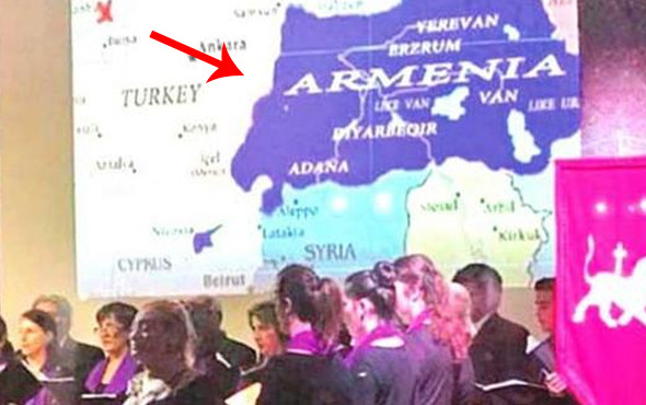 Almanya'da Ermeniler tarafından düzenlenen etkinlikte skandal bir şekilde Türkiye'nin yarısı ve Kıbrıs harita üzerinde Ermenistan sınırları içinde gösterildi