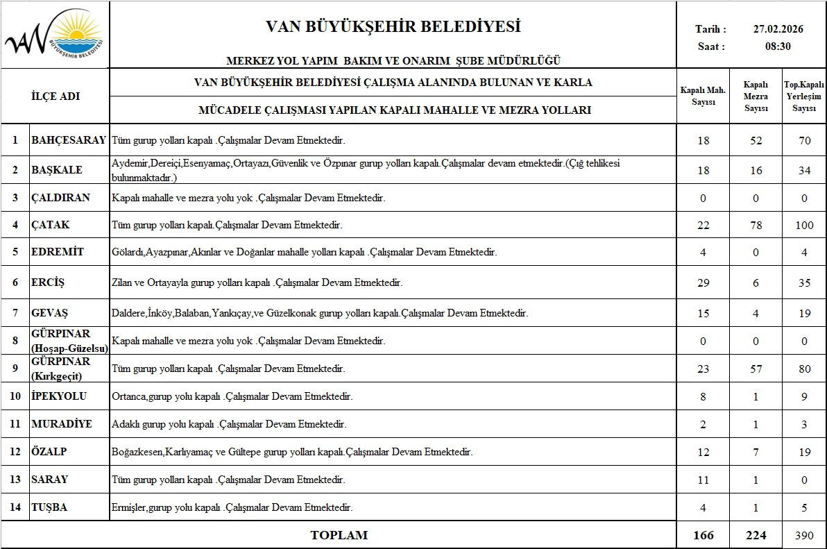 Kar yağışı kırsal kesimlerde de etkisini sürdürürken, kent genelinde 166 mahalle ve 224 mezra yolunun ulaşıma kapandığı bildirildi. Van Büyükşehir Belediyesi Yol Yapım, Bakım ve Onarım Dairesi Başkanlığı ekipleri, kapanan yolların yeniden ulaşıma açılması için kırsalda yoğun bir çalışma yürütüyor.